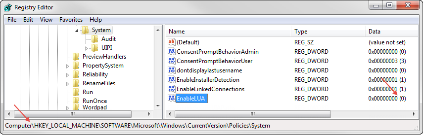 - Go to: Computer\HKEY_LOCAL_MACHINE\SOFTWARE\Microsoft\Windows\CurrentVersion\Policies\System