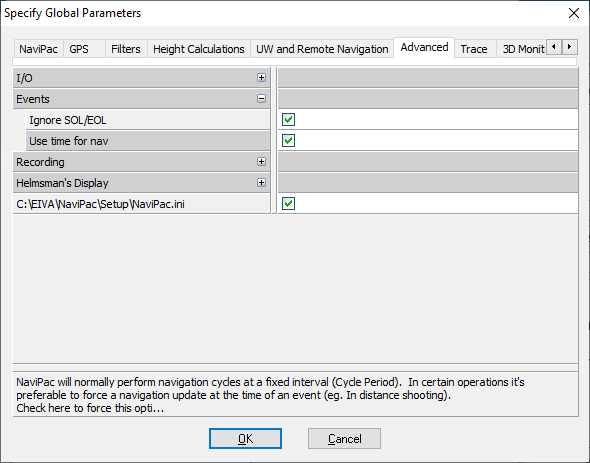 - In the Advanced tab, tick Use time for nav. Event definition as above to ensure that NaviPac performs a calculation related to the event.