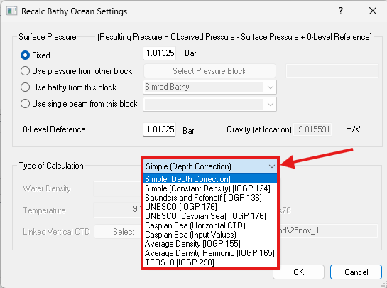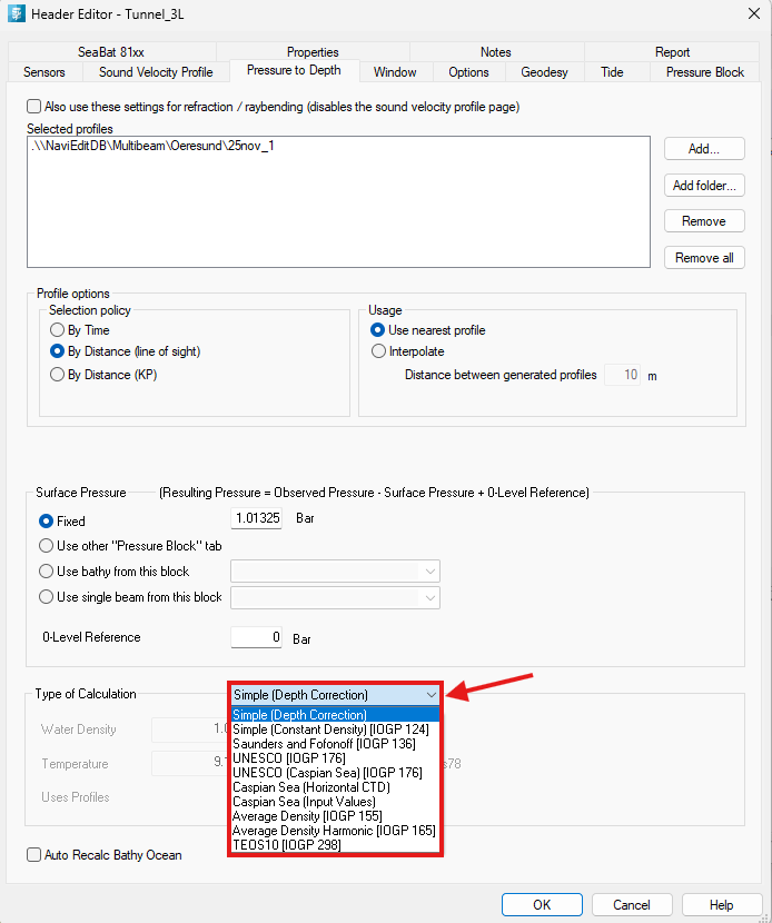 - The TEOS-10 recommendation is to perform pressure to depth calculations with a uniform assumption of the surface pressure equal to 1.01325 Bar. NaviEdit does not enforce this recommendation, and the user is free to choose other options for the surface pressure, including setting a Fixed pressure of the recommended value