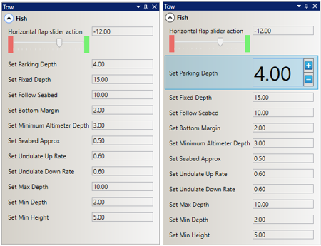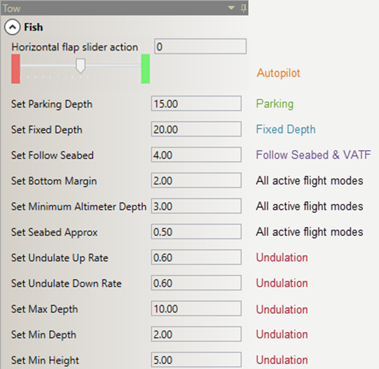 Horizontal flap slider action | Slider to change the 3D flap angle. Positive values will bring the ScanFish / ViperFish to port side, while negative values bring the ScanFish / ViperFish to starboard. | During line turns the values should be neutral |
