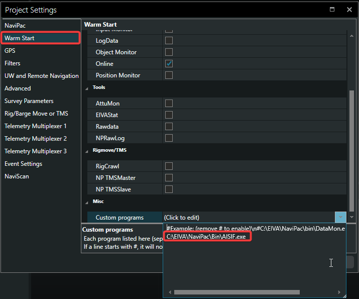 1. Add to the Warm Start the path to the AISIF.exe (C:\EIVA\NaviPac\Bin\AISIF.exe)