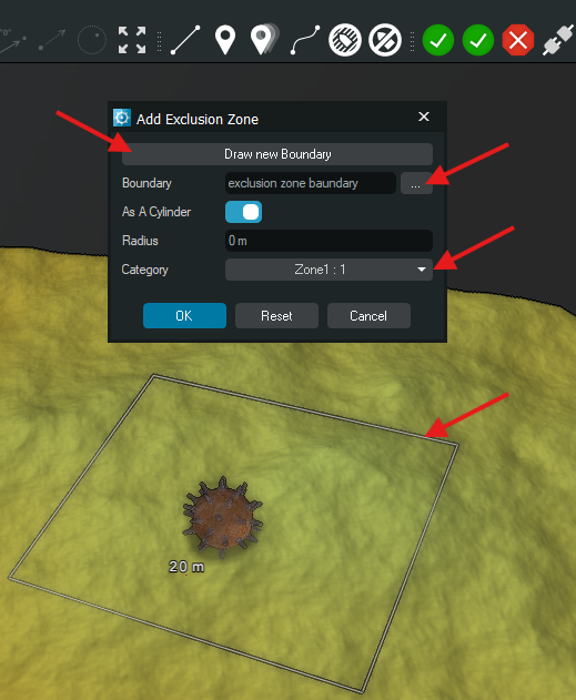 Once selected a new window will open with the following options: draw new boundary, select an existing boundary, make the exclusion zone as a cylinder (it applies only for newly created boundaries) and define a radius and assign it to a Category predefined within the Geofences Manager. Once the properties are defined press Ok. In the example below an existing boundary was used (Figure 2). The option for a simple boundary will create an exclusion zone for both horizontal and vertical axis, once the perimeter is crossed an warning will be set off. The option for a boundary as a cylinder will create an exclusion zone for a limited area on both horizontal and vertical axis as defined when drawn and once the cylinder is entered an warning will be set off.