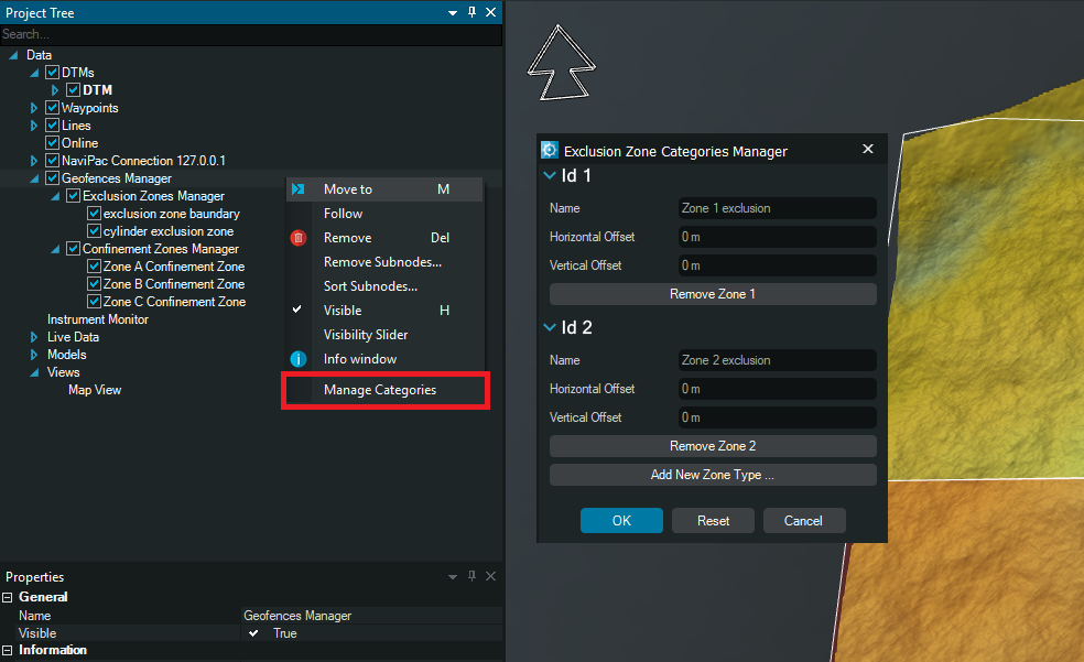 In this article the Geofences Manager feature will be presented. This feature includes the confinement and exclusion zones. If any of them or both are being created in a project each of them will be present under the Geofences node in the Project tree (Figure 1). For the exclusion zones is the node Exclusion Zones Manager and for the confinement zones is the Confinement Zones Manager.