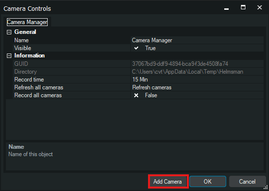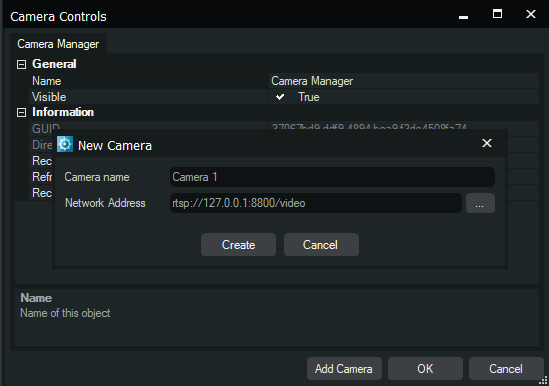 To add a camera click on the Open camera manager and in the new window press on Add camera and fill in the details for the camera that must be added in the project.(Figure 2 and 3)