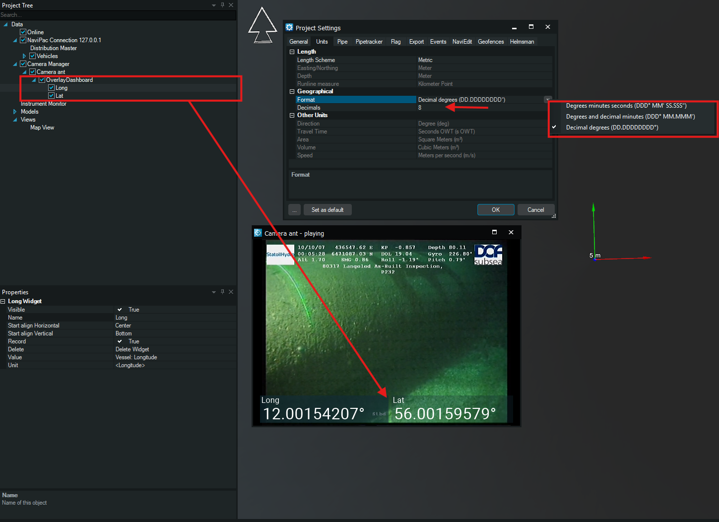 In NaviPac 4.13 the overlay for Lat Long is controlled from the Project settings Units tab, Geographical section. There are 3 options Degrees minutes seconds, degrees and decimal minutes and decimal degrees. For the first one the option for defining the decimal numbers is disabled, only for the other two you can set as desired.