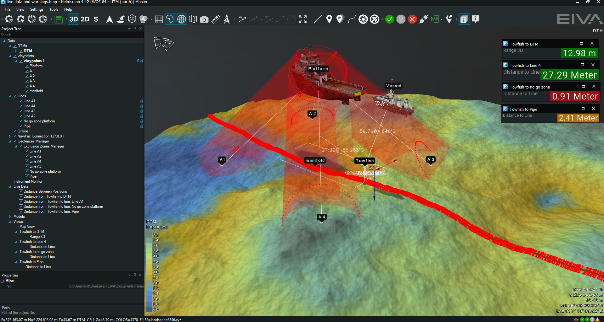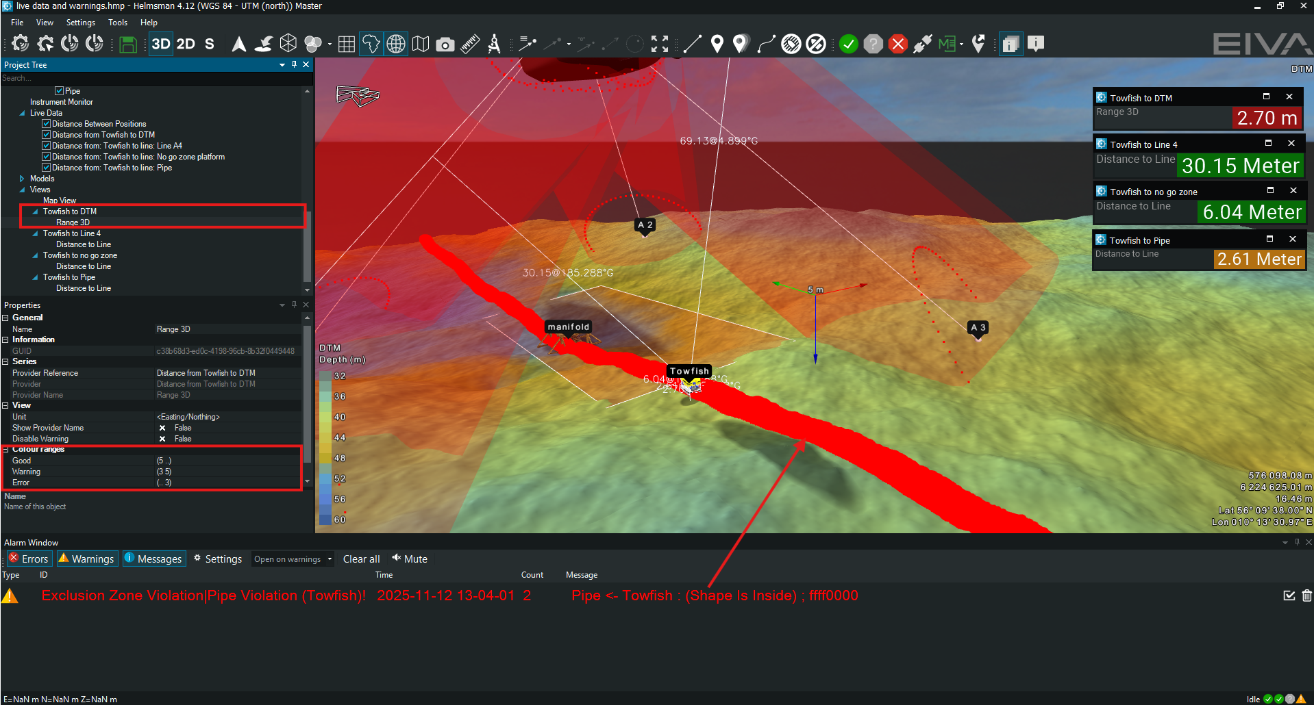 As an example we have created a scenario where a platform anchored with 4 anchors, a pipe and a manifold are present on a survey site. The towfish vehicle is not allowed to enter the no go zone defined around the manifold and close to the anchor lines or pipe. For this a series of exclusion zones have been defined and data view.(Figure 1) To create the platform, anchors, anchor lines, manifold and the pipe, lines and waypoints were used. When the rules enforced by the surveyor are breached the alarms and warnings are being set off.