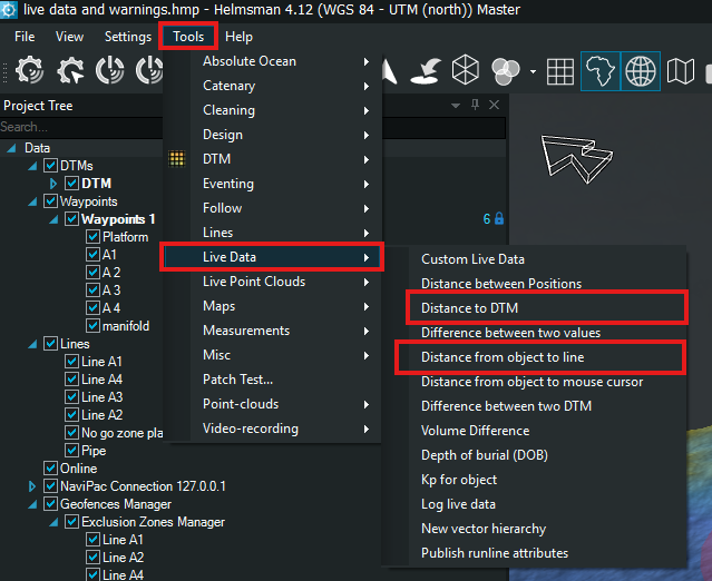 A: Helmsman display has the some features that will help the online surveyors to setup alarms and warnings for when working in a particular environment like close to a structure/platform anchored. If the positions of all the elements is known, alarms and warnings can be set by the use of exclusion zones and data views.