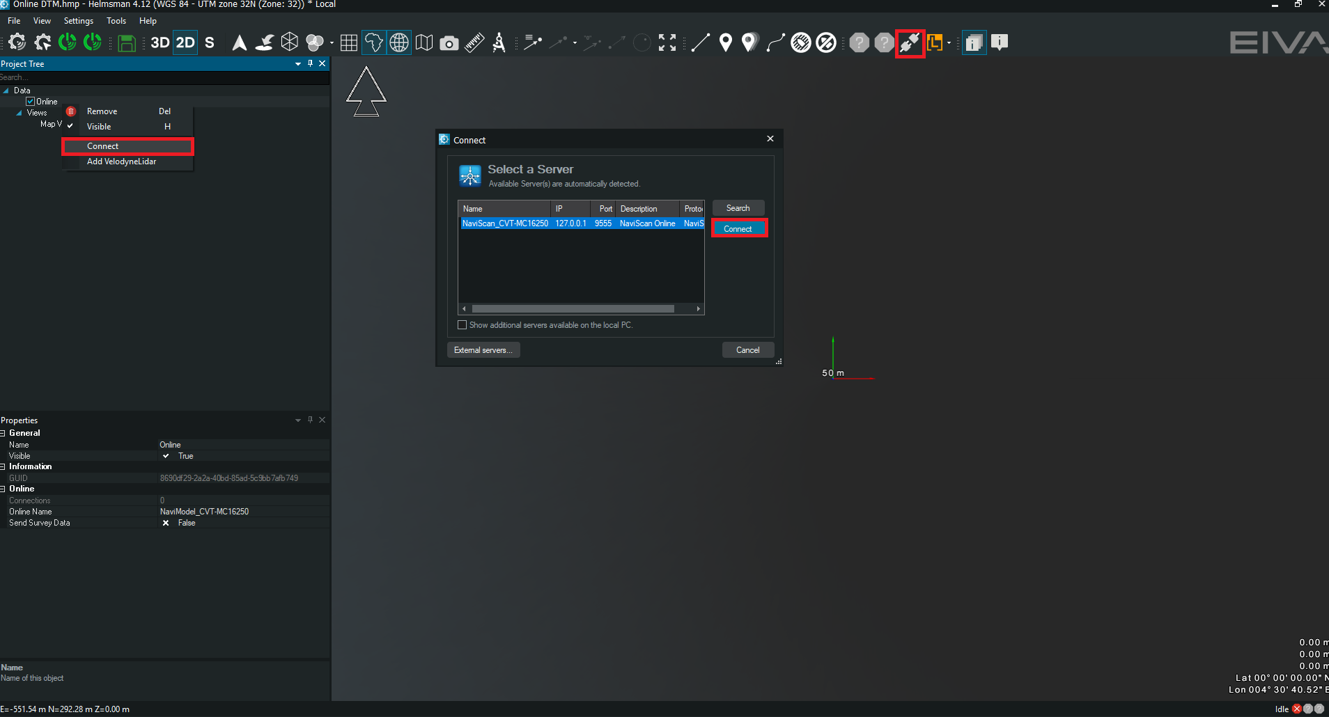 A: In Helmsman's display an Online DTM can be build for the multibeam data acquired with the instruments present in the configuration. The connection to NaviScan Online must be established first. To do so, a click on the connect button or right click on the Online node from the Project tree will open the Connect window where you can search and select the NaviScan Server (Figure 1).