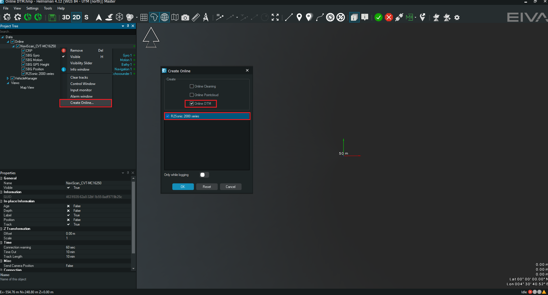 Once the connection has been established the NaviScan connection appears in the Project tree under the Online node. Right click on the NaviScan node and select Create Online. You must select the Online DTM to be created and the instrument which is providing the data. You can also choose if you want this to be created only if logging or not.