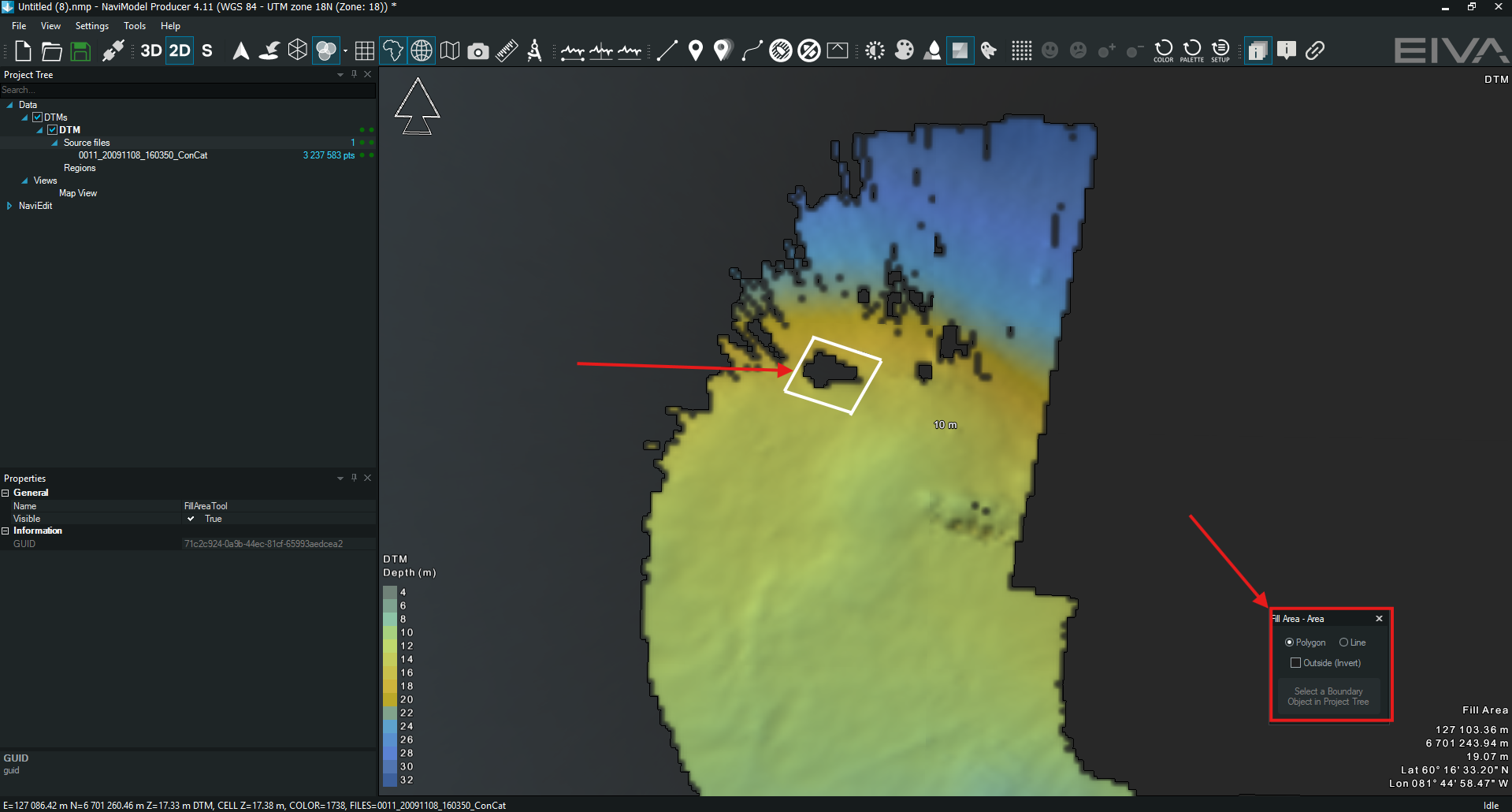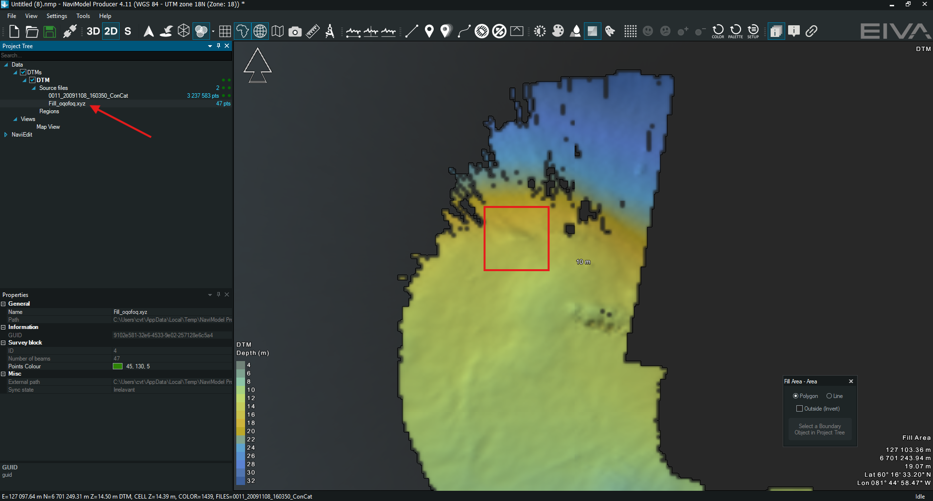 A: In NaviModel Producer 4.11 a new feature called Fill area tool has been introduced. This is available by right clicking on the DTM and select Fill area tool (Figure 1). This tool comes in support to the processing surveyors who are looking for a quick infill on the DTM and not for a full gaps interpolation on the whole DTM (the other interpolation method is to be found under the Surfaces menu - Add interpolated).