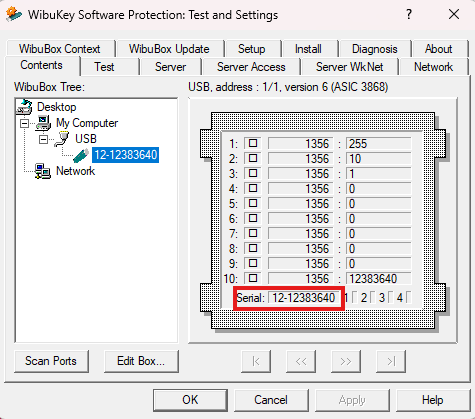 The dongle serial number can be found engraved on the hard dongle. in the Wibu Key software if you open its control panel, In the Licence Activator under the See active licences on this computer or in the Help - About section under USB dongle, serial: