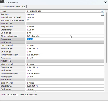 Once when you are in NaviScan Online, sonar can be controlled through Options > Sonar Controls. There will be listed all the options for Frequency and Opening angle that the sensor is sending out. Under Head option you can control Frequency and Opening angle. Each Head sent from Blueview has its own changeable parameters as for example End range is different between Frequency 900 and 2250.