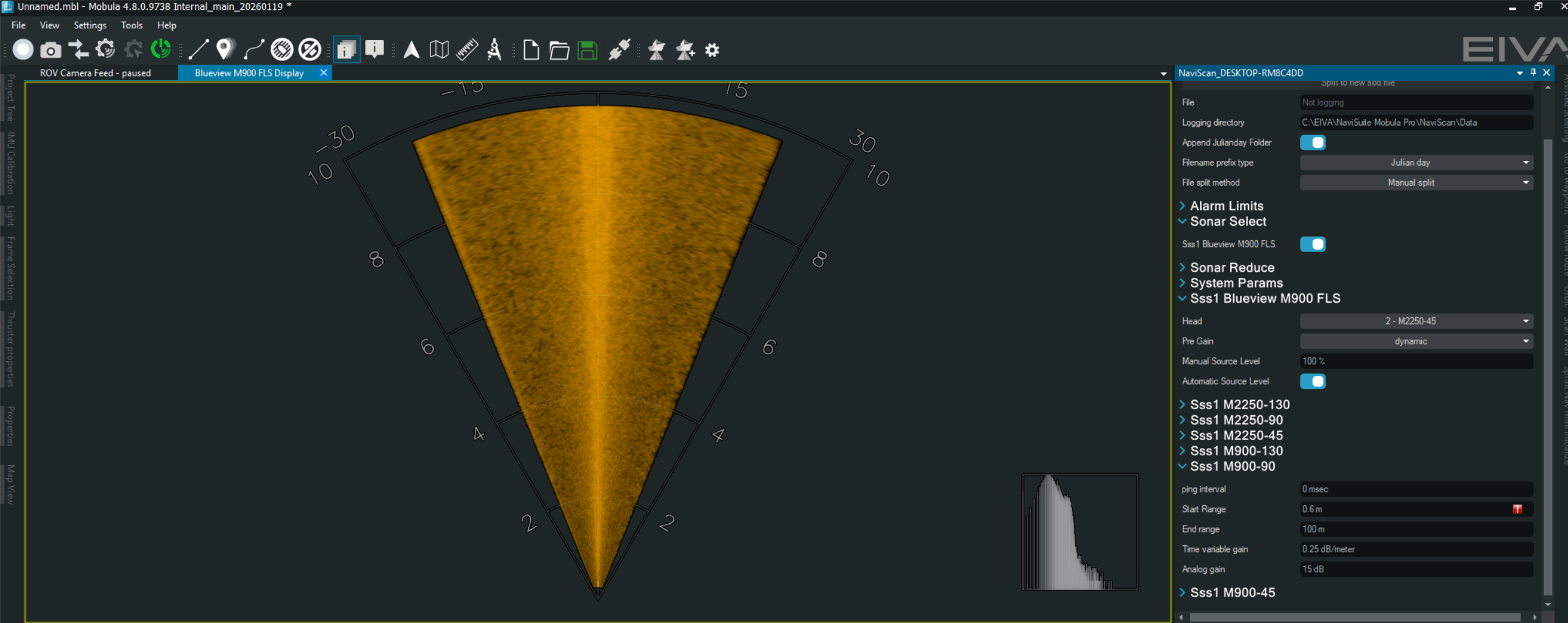 In the compatible Helmsman and Mobula interface, FLS wedge can be set to active (by right clicking in the Project tree on the device) and Sonar controls can be activated clicking on the corresponding icon. Sonar Control in Mobula and Helmsman GUI are 1:1 in functionality as the sonar Control in NaviScan Online. Bottom screenshot on the left shows FLS wedge and on the right side are available Sonar Controls for the M900/2250.