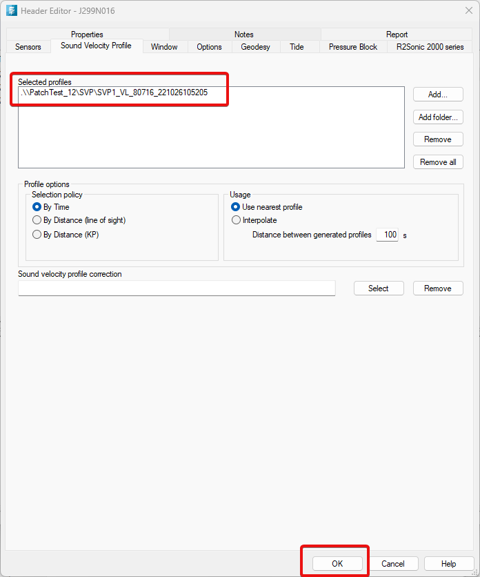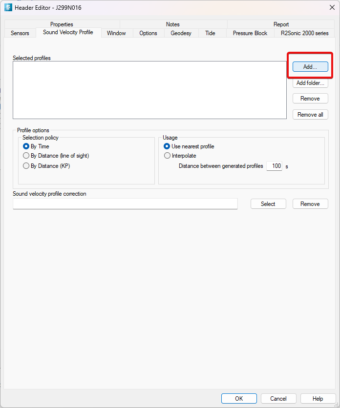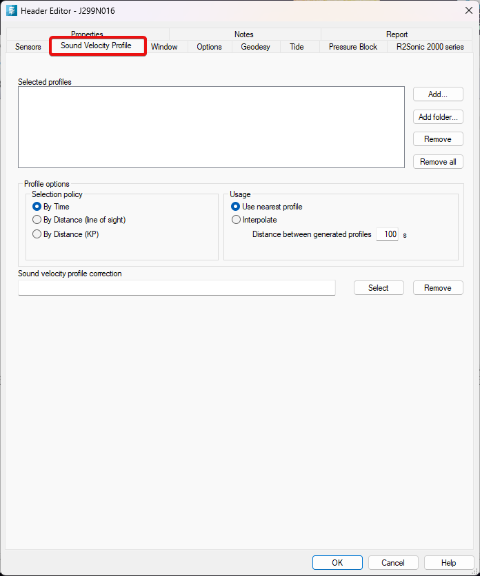 Header Editor will open and Sound Velocity Profile tab must be selected. In the selected profiles individual file can be selected or an entire folder containing them can be selected as well. For all the profiles the options Select policy (by time, distance -line of sight or kp) and Usage (nearest profile or interpolate) must be defined to be applied on the data (only if more than one svp file is selected).
