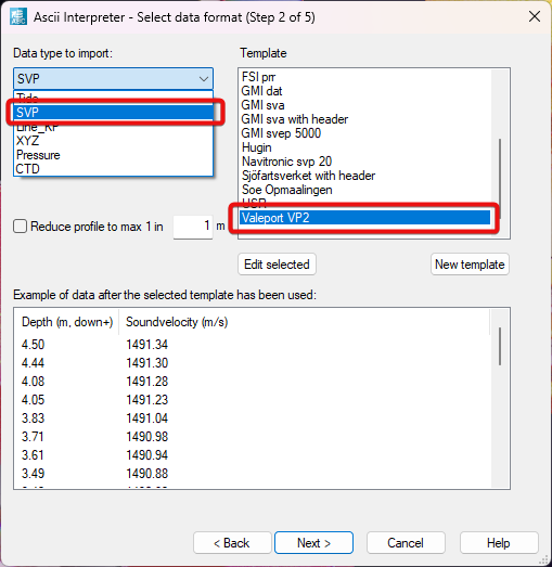 In the second step, the user must select the Data type to import - SVP and choose the correct template (if already existing or create a new one and select it). In this step, creation and editing of a new template is possible together with the preview of a section of sound velocity profile interpreted as defined in the template. Details about how to create the templates can be found in the article: NaviEdit Ascii importer header template . The profile can also be simplified/reduced by ticking the option Reduce profile to max 1 in.... and you specify the value.