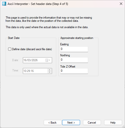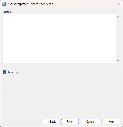 In the step 5 the user can define notes if any exist so any data processor can see them. After filling the notes section or not press Finish. Another view will appear on the screen to let the user select the location for the file/files to import. It can be a separate folder or in the same folder with the mbes data.