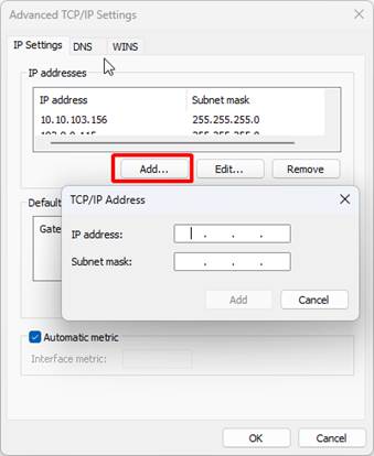 Multiple IP addresses can only be added for a network adapter whose first IP address is set manually (not assigned by a DHCP server). If DHCP is enabled on the interface, you won’t be able to add a second IP .