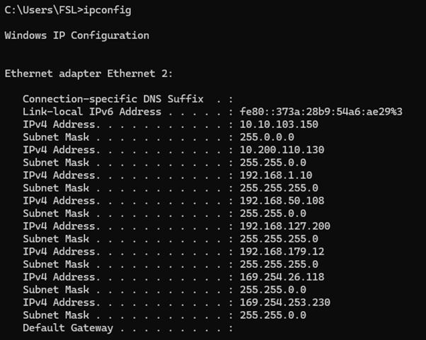 - Open a command prompt and type “ipconfig” - press Enter. This will show the current NIC IP addresses.